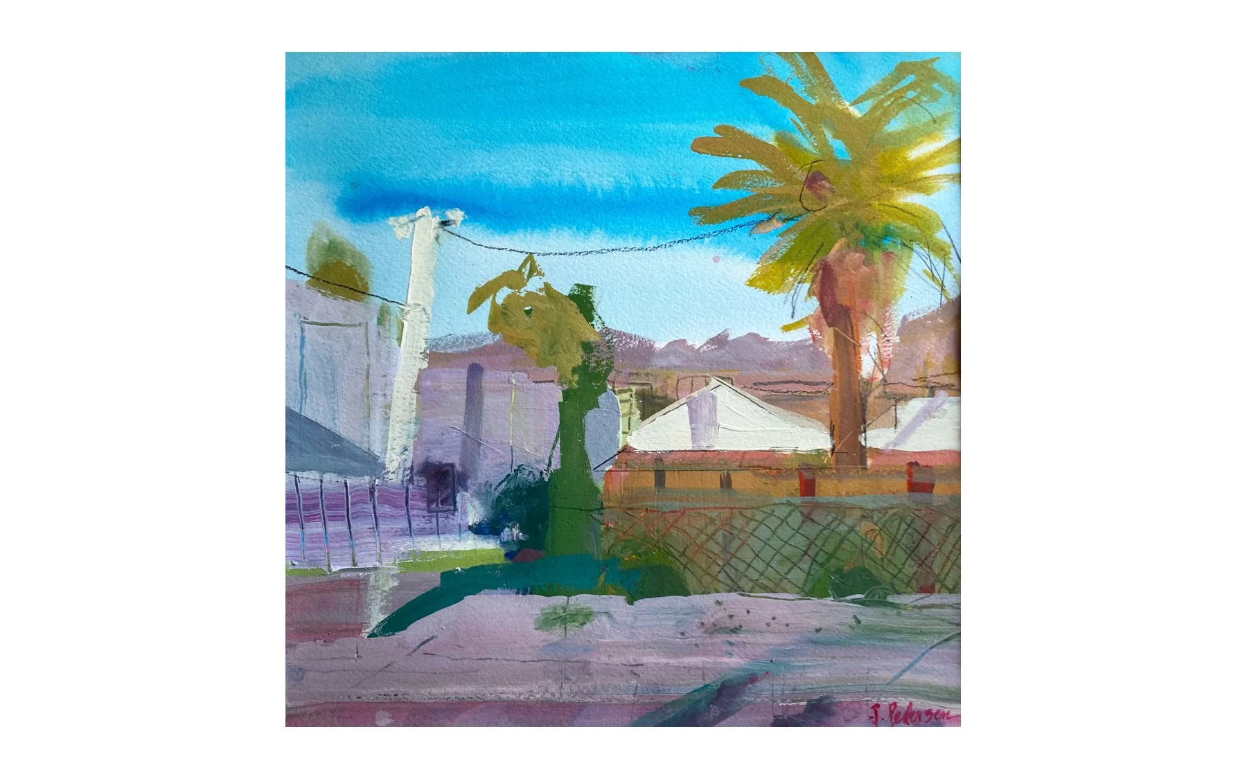 Pedersen is drawn to industrial settings with their familiar objects: telephone poles, billboards, palm trees, walls of graffiti, constant jumbles of debris—all strong design elements in her compositions. Her brightly colored landscapes are derived from simple shapes which, when brought together on the surface, create a feeling of nostalgia. Broad brushstrokes remind us of how the landscape appears looking out from the window of a speeding vehicle. As buildings and structures whiz by, both dilapidated and new, a late-day sun blankets the view with golden light.