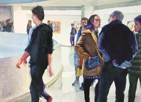 Joy Makon’s watercolors depict people looking at artwork with the open spaces of The Guggenheim Museum as a backdrop. Makon’s fascination with overlapping figurative forms, ambiguity of shapes, and a little bit of storytelling comes through in these works on paper. Makon dedicates these paintings in memory of Jim Manwell. A staunch supporter of 440 Gallery, Jim rarely missed a chance to stop in to chat and offer up an opinion or some advice. Jim first saw these watercolors at Makon’s open studio in 2019. Jim went crazy over them and often asked why she hasn’t shown them at the gallery. “I never found the right place for them,” says Makon. “Until now.”