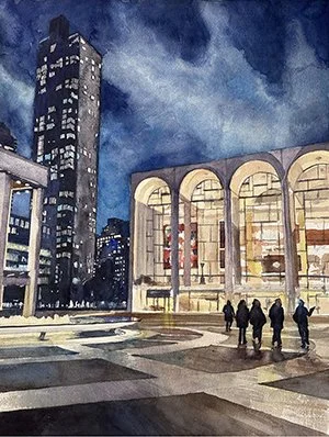 Joy Makon paints watercolors of familiar and well-known places: Park Slope’s Ninth Street by Prospect Park, iconic Lincoln Center in Manhattan. By choosing to paint these locations at sunset and at night, Makon focuses her attention on mood and atmosphere. The drama of the light, sky, and buildings at night is captured in Lincoln Center Sketch, a notable view to anyone who has stood on that plaza and been awed by the grandeur. In describing the scene she captures in Sunset on Ninth Street, Makon states, “There is a certain point when the sun has almost set, and surroundings become ambiguous, forms blur, and brief flashes of light define what one sees.”