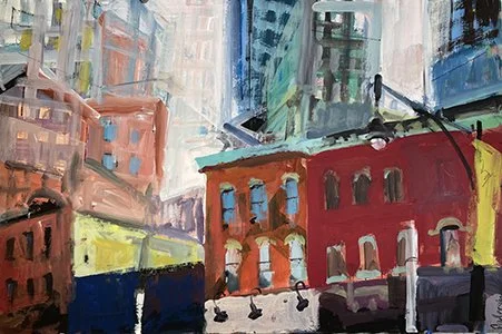 Janet Pedersen’s paintings on paper and panel represent cityscapes based on iPhotos taken around Brooklyn and Manhattan. The wealth of visual material amidst the jumble of architectural mass prompts Pedersen to ask herself how to capture a composition, whether en plein air or in the studio. Rather than rendering the scene directly, she reframes it by using various parts of the locations captured in her photos and combining them to create a new, imagined view. The patterns of the cityscape become her underlying structure, and Pedersen finds a rhythm that guides her in the physical process of putting down paint.