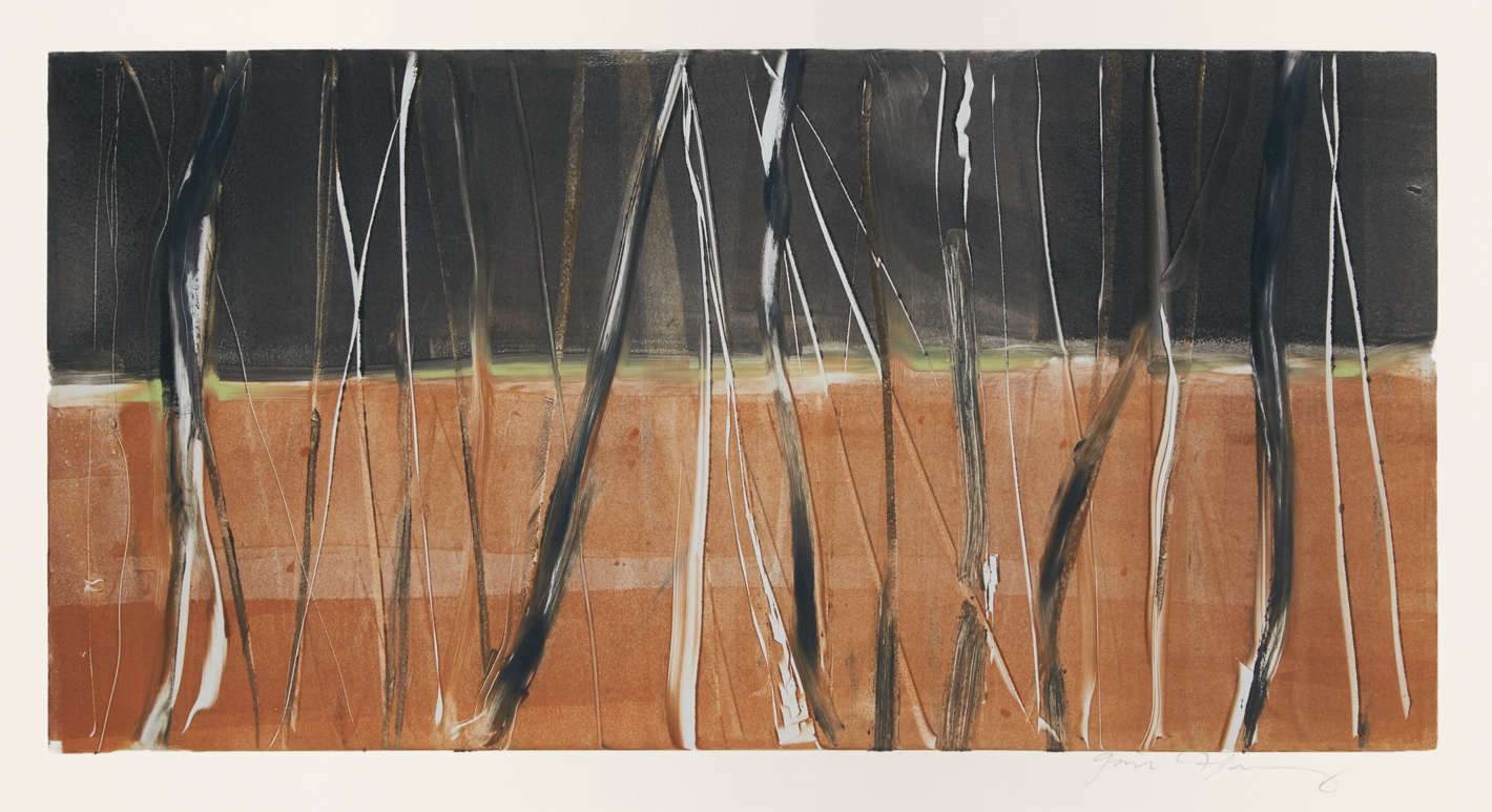 Gail Flanery’s devotion to trees is longstanding. Her daily walks in Prospect Park provide inspiration for her work, which is primarily printmaking but often incorporates pastel or collage. Flanery uses the linear structure of the leafless trees in winter as the basis for this work. She states, “My imagery is fed by nature.” The branching pattern of trees is a motif that has threaded its way through Flanery’s work for quite some time.