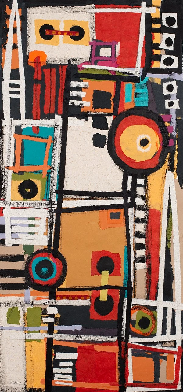 Jo-Ann Acey’s series Urban Beat explores the patterns and motion of city life. Employing assemblage and paint, her visual rhythms create a complex view of the urban environment. Acey says of her subject, “The city is a resource of rich visual information; I find pattern and repetition everywhere. In this series, I use collage as a natural extension of my two-dimensional work of painting and drawing. The creative process remains the same. I am still building a surface, adding and subtracting line, color and shapes. I think of the finished compositions as maps or aerial views.”