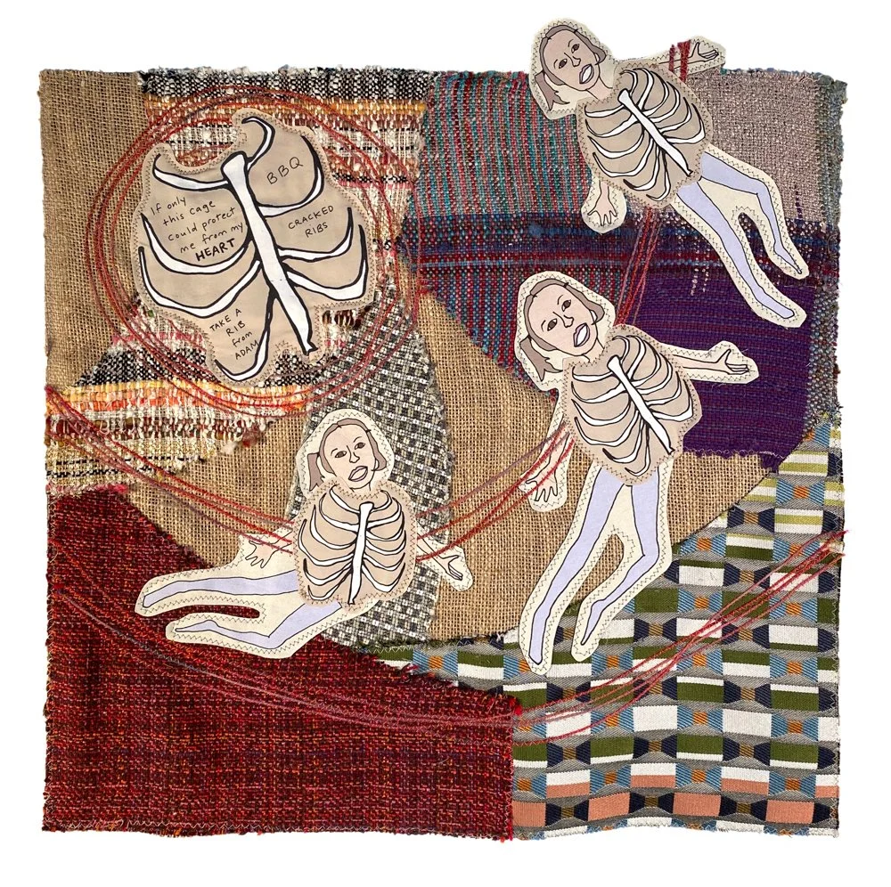 Juliet Martin creates pieces from fiber, original illustration, and snippets of text that she combines to form tapestries and drawings. Martin’s tapestries are hybrid paintings made by joining hand-woven and machine-made fabric and yarn, and inkjet prints on cloth. Her drawings reveal a humorous side and are absurd: kitty cats posing as little girls, a moaning little gymnast, and more. Language ties these pieces together into a form of an illustrated storybook, with a narrative that is as much poetry as it is artwork.